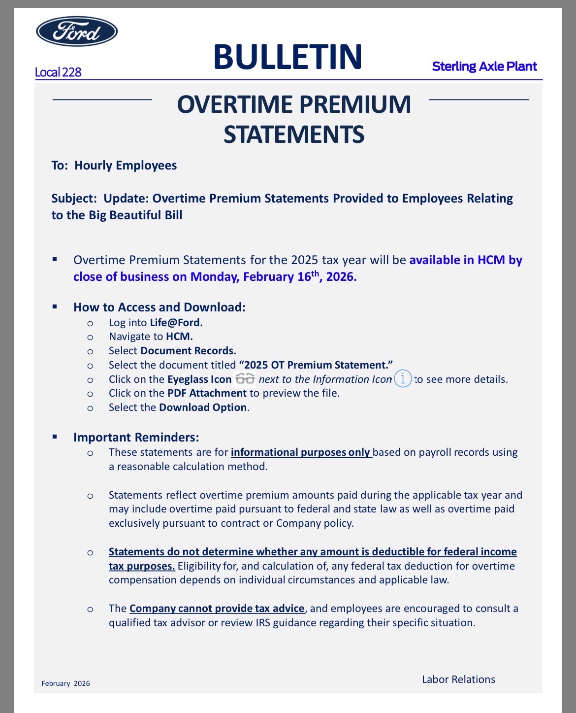 Overtime Premium Statements for the 2025 tax year will be available in HCM by close of business Monday, February 16, 2026. Log into Life@Ford → HCM → Document Records → “2025 OT Premium Statement” to download. Statements are for informational purposes only. The UAW/Company cannot provide tax advice.